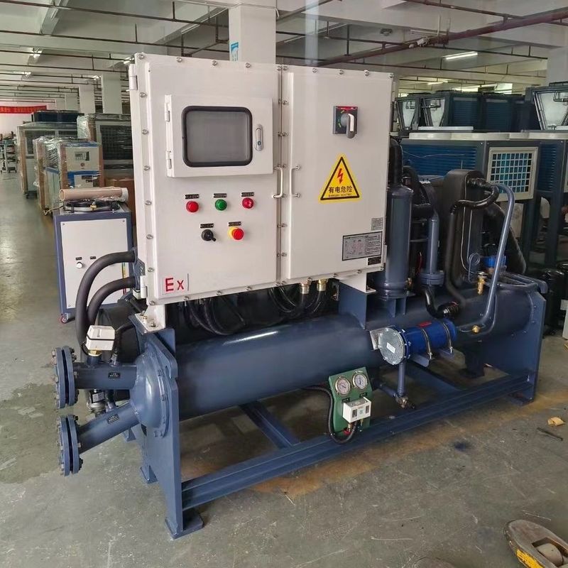 Un enfriador a prueba de explosión de tornillo enfriado con agua es un dispositivo de refrigeración diseñado para funcionar en entornos peligrosos donde puedan estar presentes gases o vapores explosivos.La siguiente es una descripción de este enfriador: